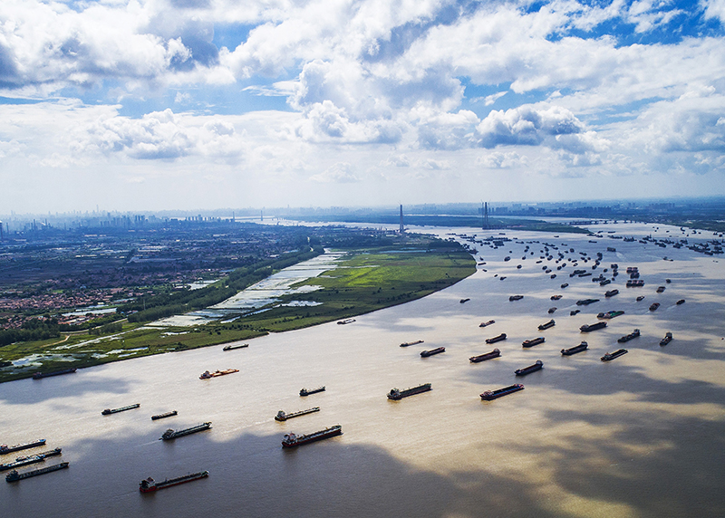 船舶在湖北省武漢市陽(yáng)邏港區水域行駛(2018年8月13日攝,無(wú)人機照片)。新華社記者 肖藝九 攝